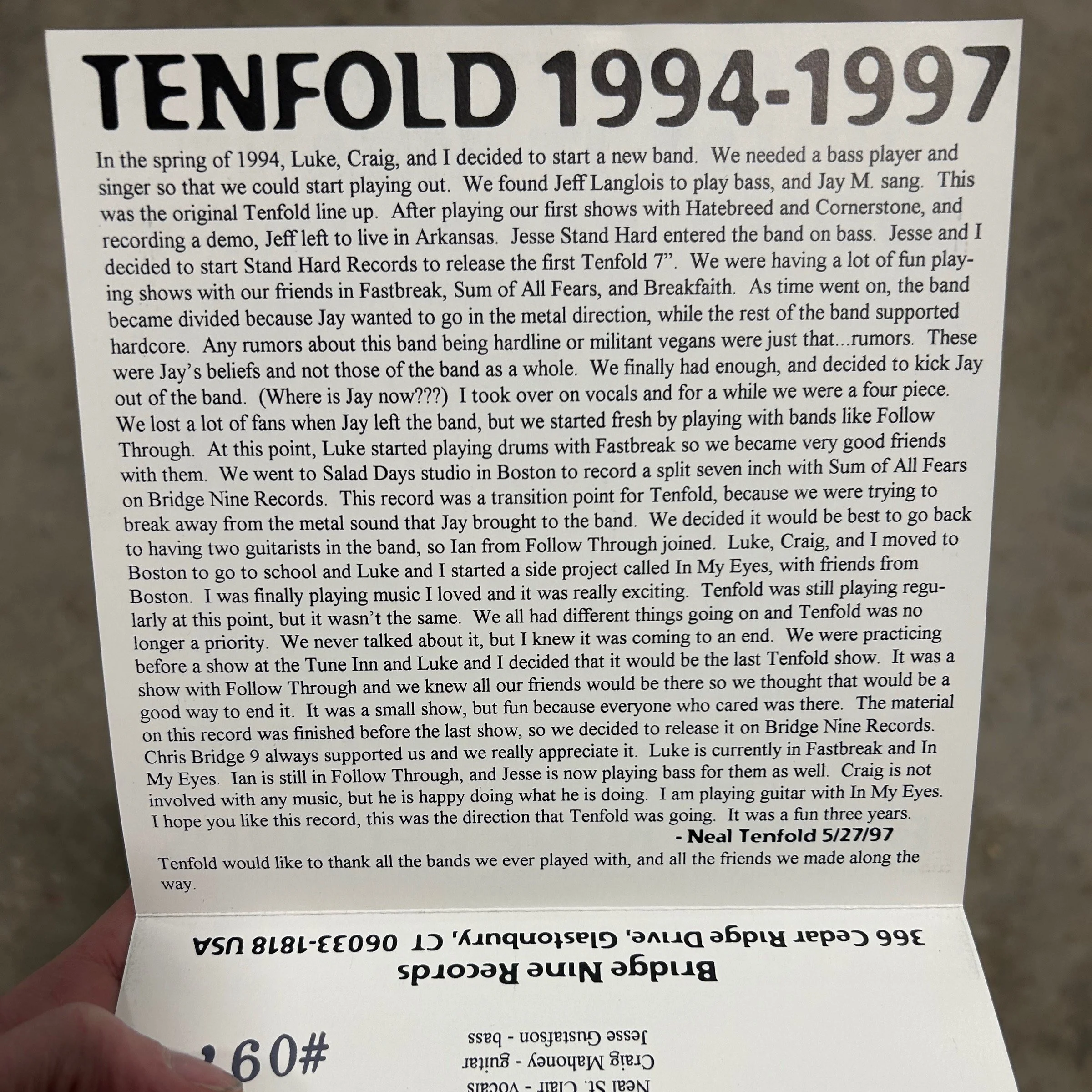 Bridge Nine's 2nd release, this three-song 7-inch was posthumously released after the band had broken up. Two members of Tenfold had recently moved from Connecticut to attend school in Boston and had started a new band with friends there called In My Eyes. IME had an opportunity to sign with Revelation Records pretty much after they released their demo, so the band ultimately broke up without warning while playing a show at the Tune Inn in New Haven, Connecticut. This EP had been recorded (along with a cover of Judge's "Holding On") in a recent session, so Bridge Nine offered to release them on vinyl. A first pressing of only 300 copies sold out pretty quickly, so a 2nd (and final) pressing of 500 on black vinyl was released. Members of Tenfold went on to also perform in Fastbreak, Piebald, Right Brigade, Follow Through, Invasion, American Nightmare, and several other bands.