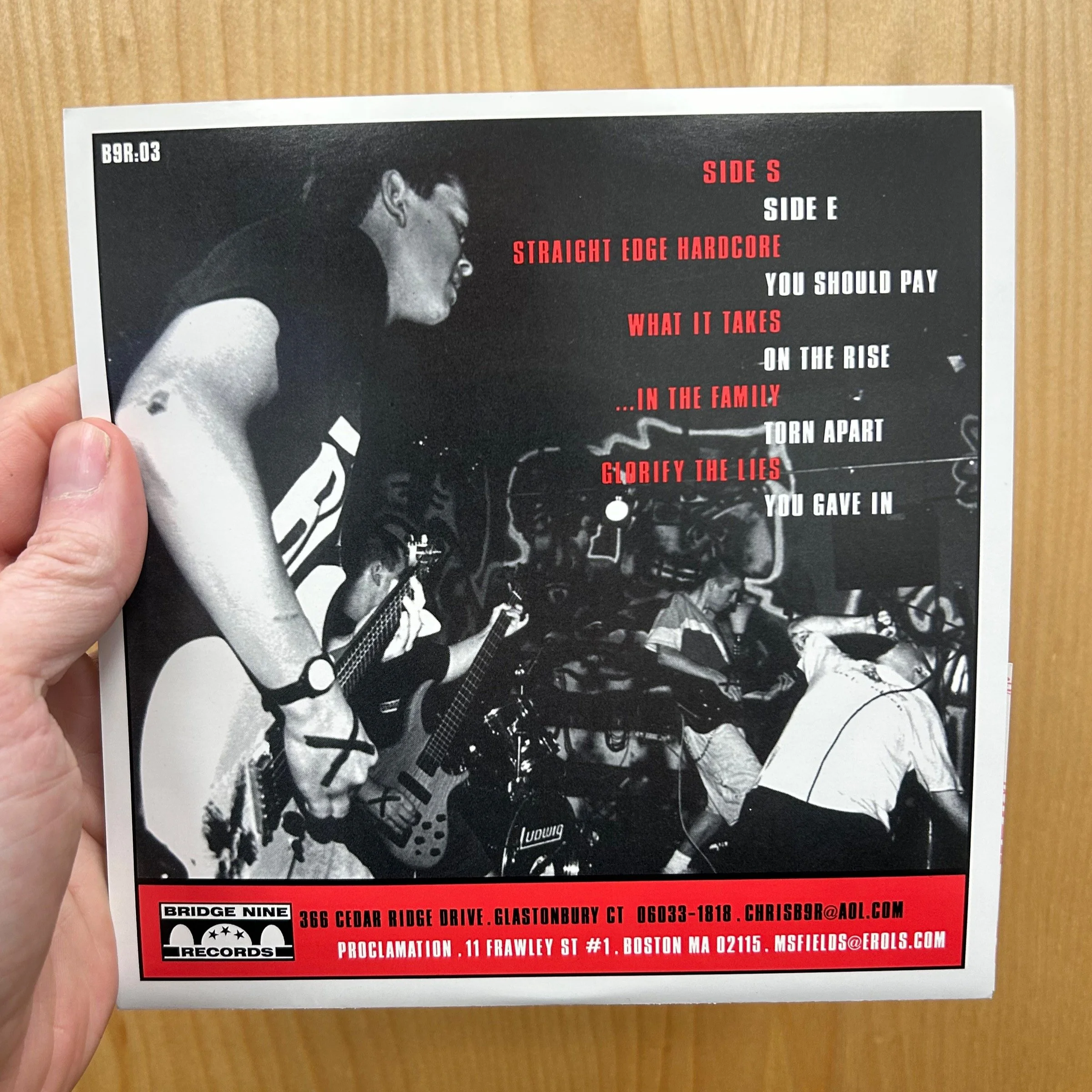 The PROCLAMATION Straight Edge Hardcore 7-inch was Bridge Nine’s third release, and the first from a Boston band on the label. It came out in the winter of 1998, but after almost a year and a half of letter correspondence between Chris Wrenn and vocalist Mark Fields. This eight-song EP was recorded by Chuck Yearke and was pressed twice; the first pressing of 1001 copies on three variants: white (101), red (200), and black (700). It was repressed shortly after on clear vinyl (380).
