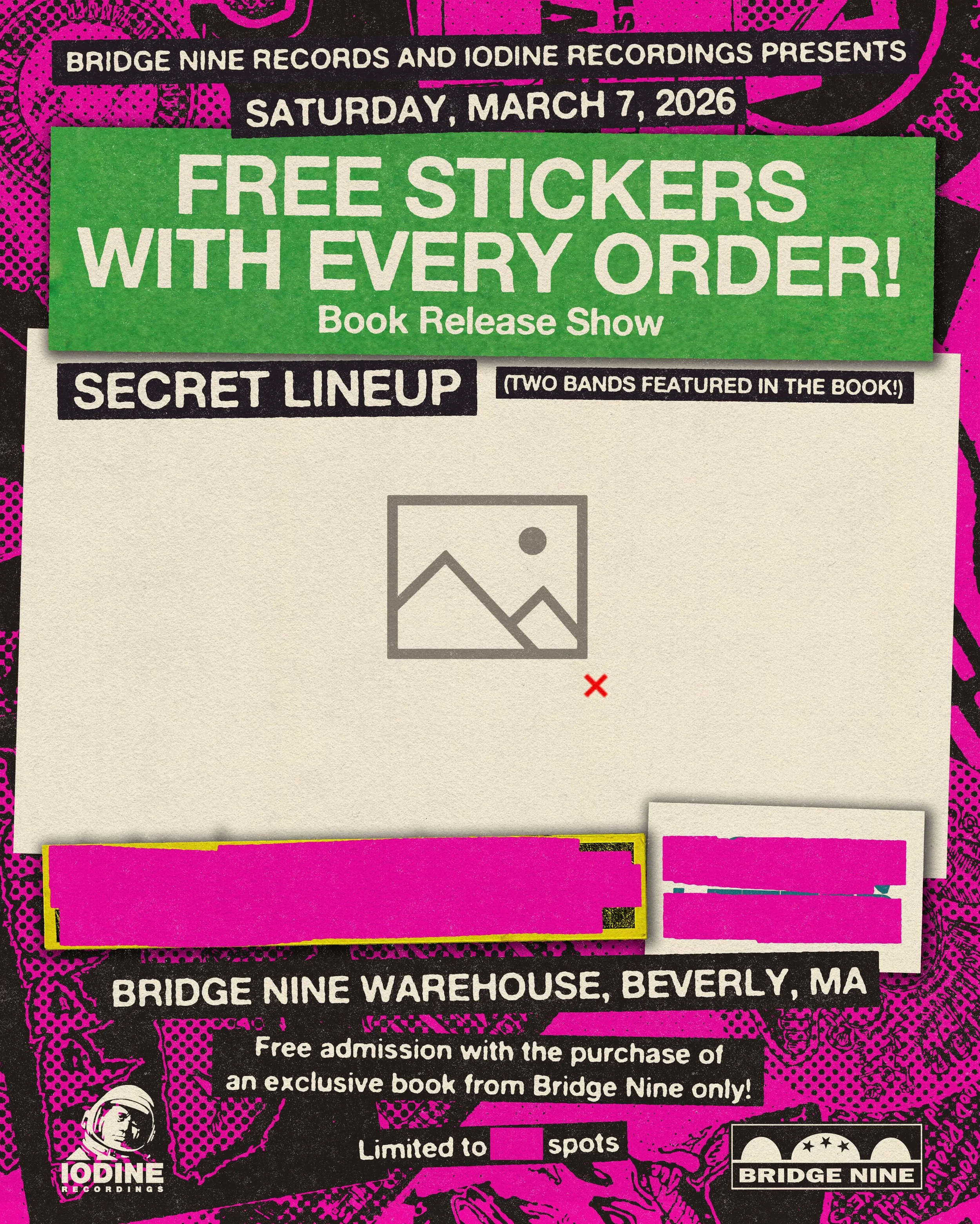 Bridge Nine is helping Iodine Recordings celebrate the release of their new book by Thomas Rackow, Free Stickers with Every Order: A History of Hardcore Stickers ($39.95), by hosting a very intimate performance in our warehouse with two bands featured in its pages. We can't tell you who it is yet, but if you've checked out our other shows with bands like Agnostic Front, Ten Yard Fight, H2O, New Found Glory, and American Nightmare, you know it's going to be special. It's happening on Saturday, March 7th.