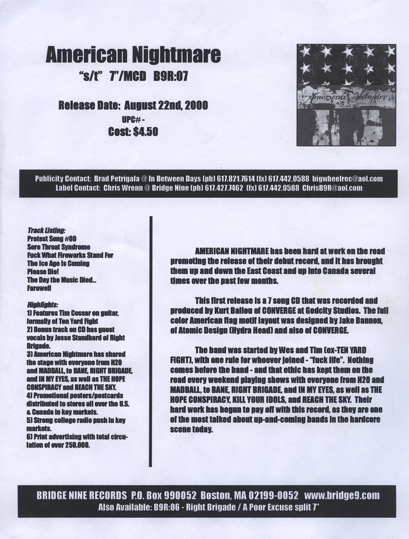 The single that helped put Bridge Nine on the worldwide map. Officially released in stores on August 22nd, 2000, this 6 song 7" (and 7 song CD) paired vocalist (and lyricist) Wes Eisold with Ten Yard Fight's Tim Cossar. The first version available for sale was the "Please Die!" labeled records on blue vinyl, with hand numbered center labels and in an edition of 300 copies. A clear vinyl version was limited to 100 copies with hand cut covers slipped into picture disc sleeves, this was considered a "friends press" and was given to many of the bands friends (each copy given away has the name of the friend it was given to on the back of the cover). The red vinyl with special yellow and blue covers (featuring a photo ofthe band "Straight Ahead" and referred to as the "Mosh Camp" editions) were created by Wes and distributed to friends as well. The 2nd pressing was limited to only 250 copies on gray vinyl, with hand numbered center labels and hand cut covers, and was released (and pretty much sold out) at the Fall 2000 "Back To School Jam" show in Framingham, Massachusetts. Later, after the third pressing of 900 on black vinyl exhausted the labels supply of hand-glued strapped 7 inch sleeves, a fourth and final pressing on black vinyl was released, in an edition of 600 copies and featuring a special fold-over cover featuring artwork by illustrator (and friend of the band) Linas Garsys. The 7" version of this EP is out of print but the songs make up side A of the 12" compilation "Year One", which also includes the bands 2nd EP.
