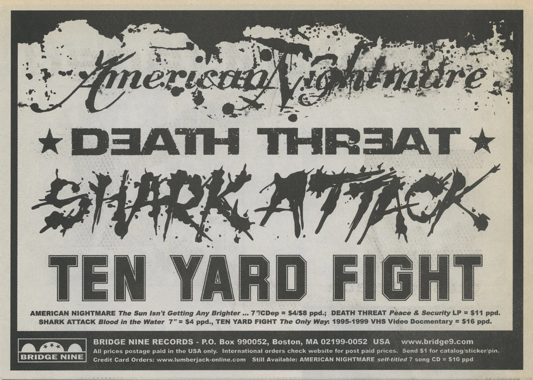 American Nightmare's 2nd EP, featuring four listed songs (and a hidden cover of the Cro-Mag's "It's the Limit"). The cover of this ep featured the debut of their iconic angel (illustrated by Linas Garsys). There are two different test pressings for this release. The first test was rejected, and the 2nd (now approved) version features "RE" also etched on the matrix of the record. This single features a "friends press" on orange vinyl, which was given to friends (and randomly sent out in some mail orders). The entire rest of the first pressing was pressed on black vinyl, with the only difference in variants being the color of the paper used on the center labels, which varied from red, white, blue, and silver labels. The 2nd pressing, also on black vinyl, is distinguished by the center labels as well, only instead of having black ink on color (or silver) paper labels, SILVER ink was printed on a flat black paper. The third pressing saw the EP returning to color vinyl, with special "Fall 2001 European Tour" center label on translucent purple vinyl. A fourth, and final pressing put the EP back on black vinyl with black ink printed on silver center labels, but to distinguish this pressing from the nearly identical earlier first pressing, a tiny Roman numeral"IV" was placed just below the Bridge Nine logo. The 7" version of this EP is out of print but the songs make up side B of the 12" compilation "Year One", which also includes the bands debut EP.