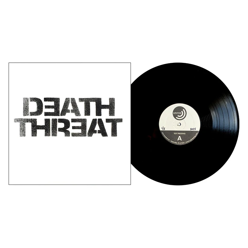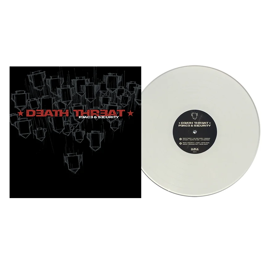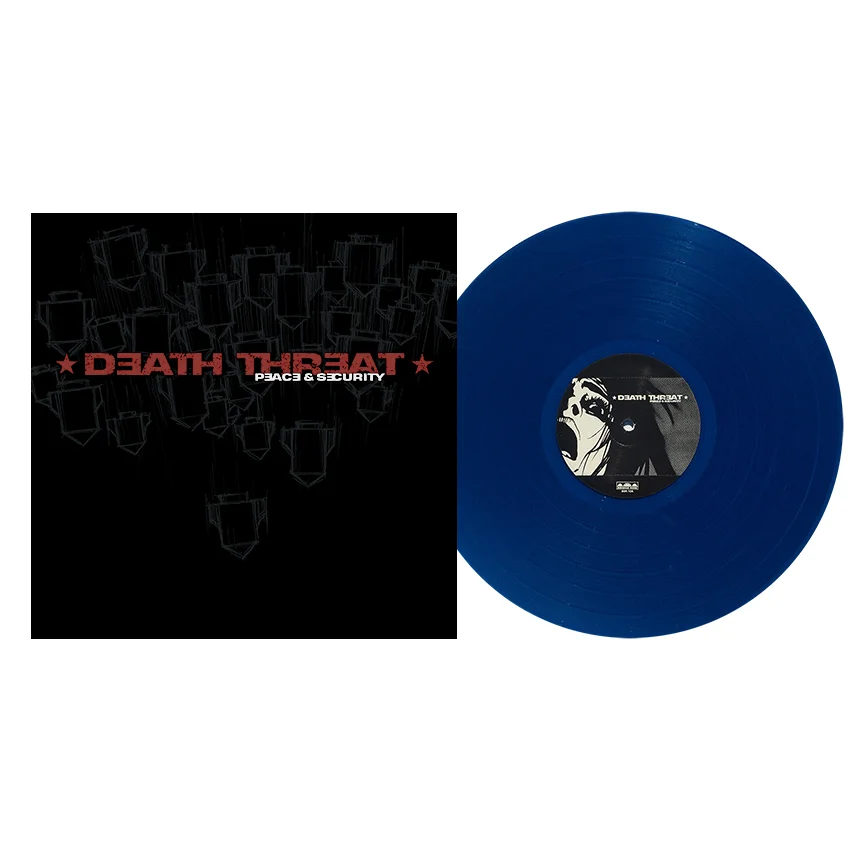 Bridge Nine's first 12" LP vinyl release, Death Threat's "Peace & Security" album. Originally released on CD the year before by Triple Crown Records, this album was re-issued on vinyl with alternate cover artwork. The first pressing has a more muted cover art (with a very glossy surface & it's difficult to see the low contrast illustration of the bombs on the front and back). An edition of 40 copies on blue vinyl were made available at the Bridge Nine "Triple Release" in Providence, Rhode Island when the band played with American Nightmare, Shark Attack & The Hope Conspiracy and it features a metallic copper spray painted Death Threat logo on 12" picture disc sleeves.