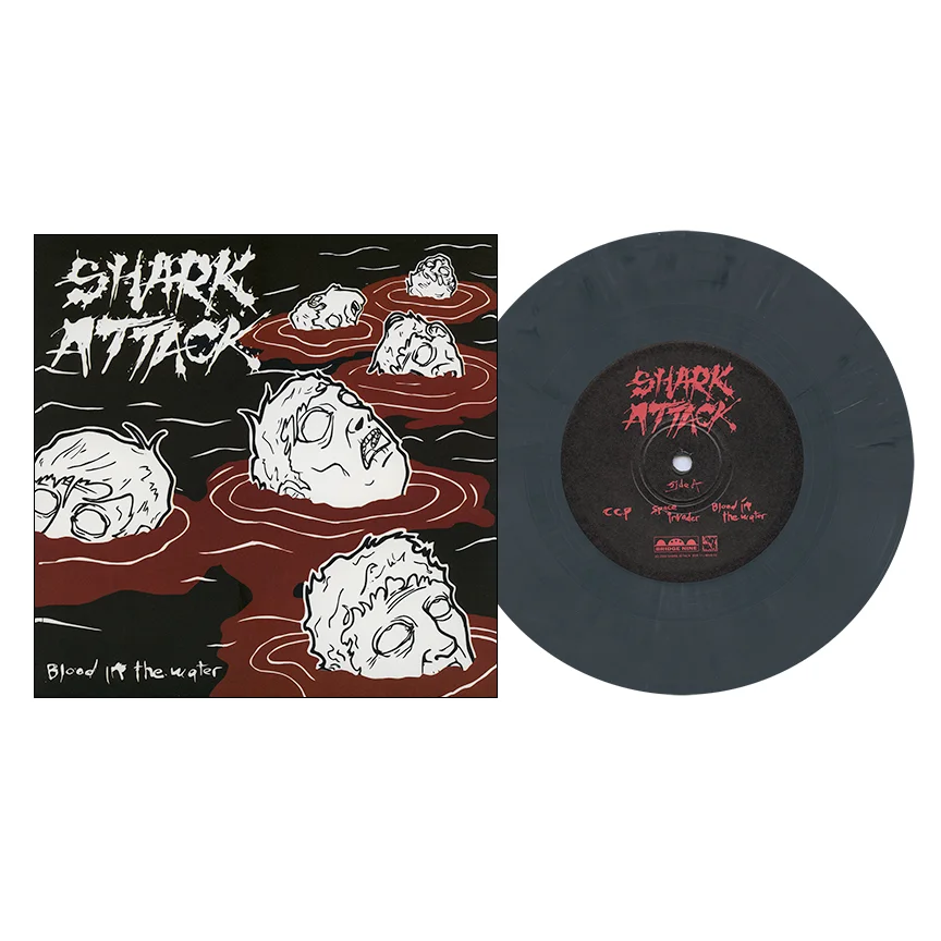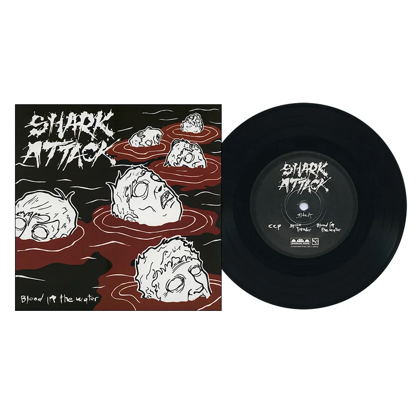 The Shark Attack Blood in the Water EP was originally released by vocalist Matt Summers' My War Records label in a single pressing of 500 copies, hence the "MW:02" etching on the matrix and absence of a Bridge Nine edition of the test pressing. It was a nod to the self-released EP of one of their influences, NYC's Antidote, who released their debut in the same quantity on black 7-inch vinyl in 1983. This EP was already a collector’s item by the time Bridge Nine released our first edition of 2,000 copies. Slightly different center label artwork was created, notably printed in black ink on red paper on gray, red & black vinyl. The final pressing of 1,000 copies on black vinyl has the same artwork as Bridge Nine's first, but it is printed on white paper center labels instead of red.