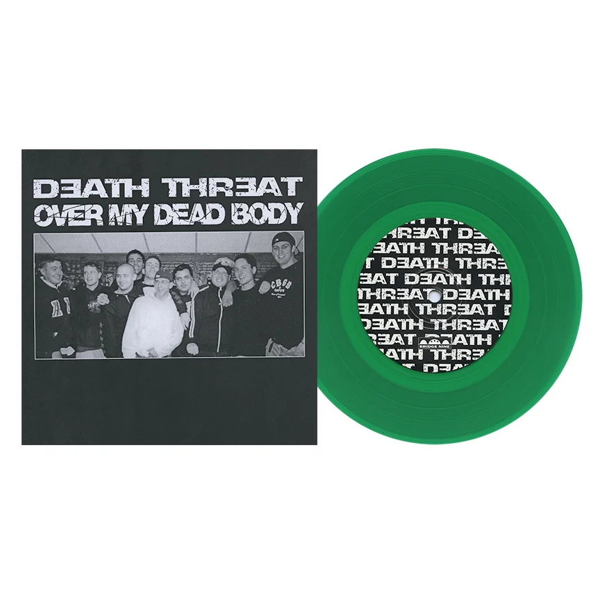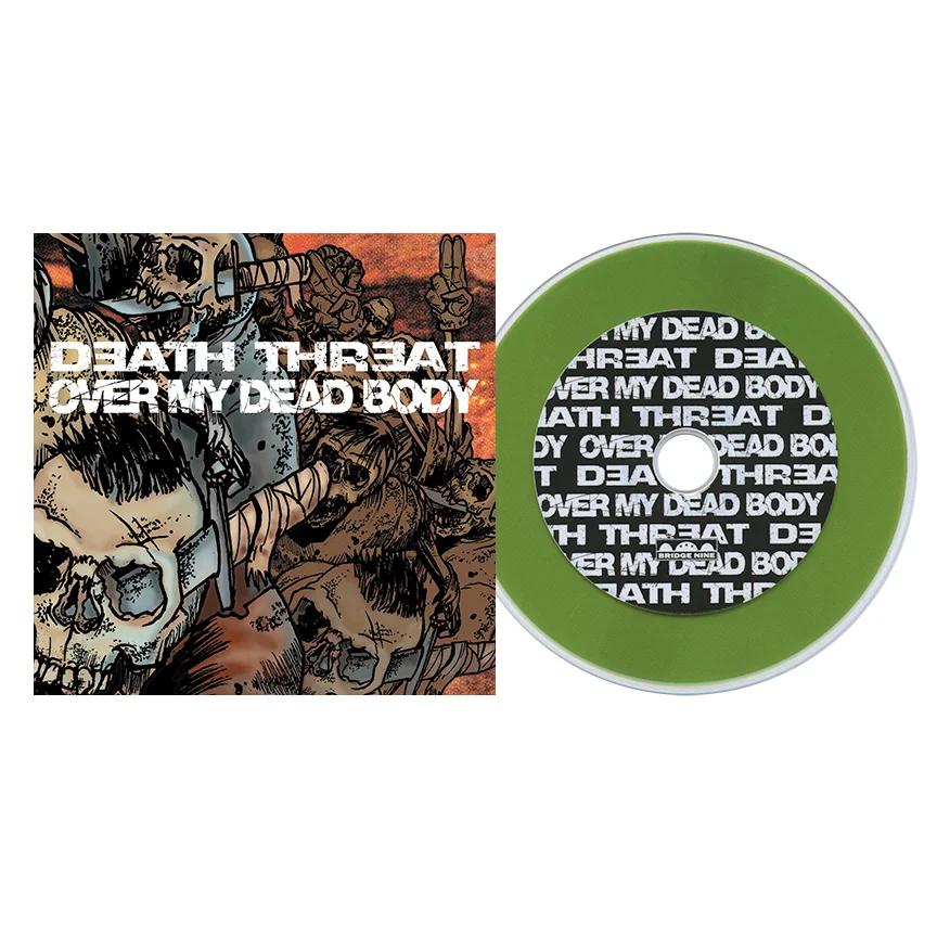 The fifth Bridge Nine release to include visual contributions by illustrator Linas Garsys, this split pairs up East Coast vs. West Coast, with Death Threat (CT) and Over My Dead Body (CA), respectively. Each band contributed two new original songs as well as a cover from a band on the opposite coast (Death Threat covering Chain of Strength's Best of Times and OMDB covering No Class by Reagan Youth). The first pressing included 100 green vinyl records with white paper photo copied "tour" covers (sold by Over My Dead Body) and 100 green vinyl records with red paper photo copied covers (sold by Death Threat). Sometime after the 3rd pressing of 1,000 copies was released, we realized that we still had about 250 printed covers left, so a final edition of 250 records on red vinyl was pressed, with DT and OMDB spray painted on their respective blank paper center labels. This EP was also available as a limited CD pressing, with two different "fan disc" variants (fan discs were CD EP's that had a smaller CD disc but a clear plastic edge to make it a standard CD size). We printed the clear part of the disc with two different colors (pictured here, green) to simulate a translucent color 7 inch record. The vinyl (and CDEP) versions for this release are out of print but the songs are available on Bridge Nine Singles Collection Volume 2.