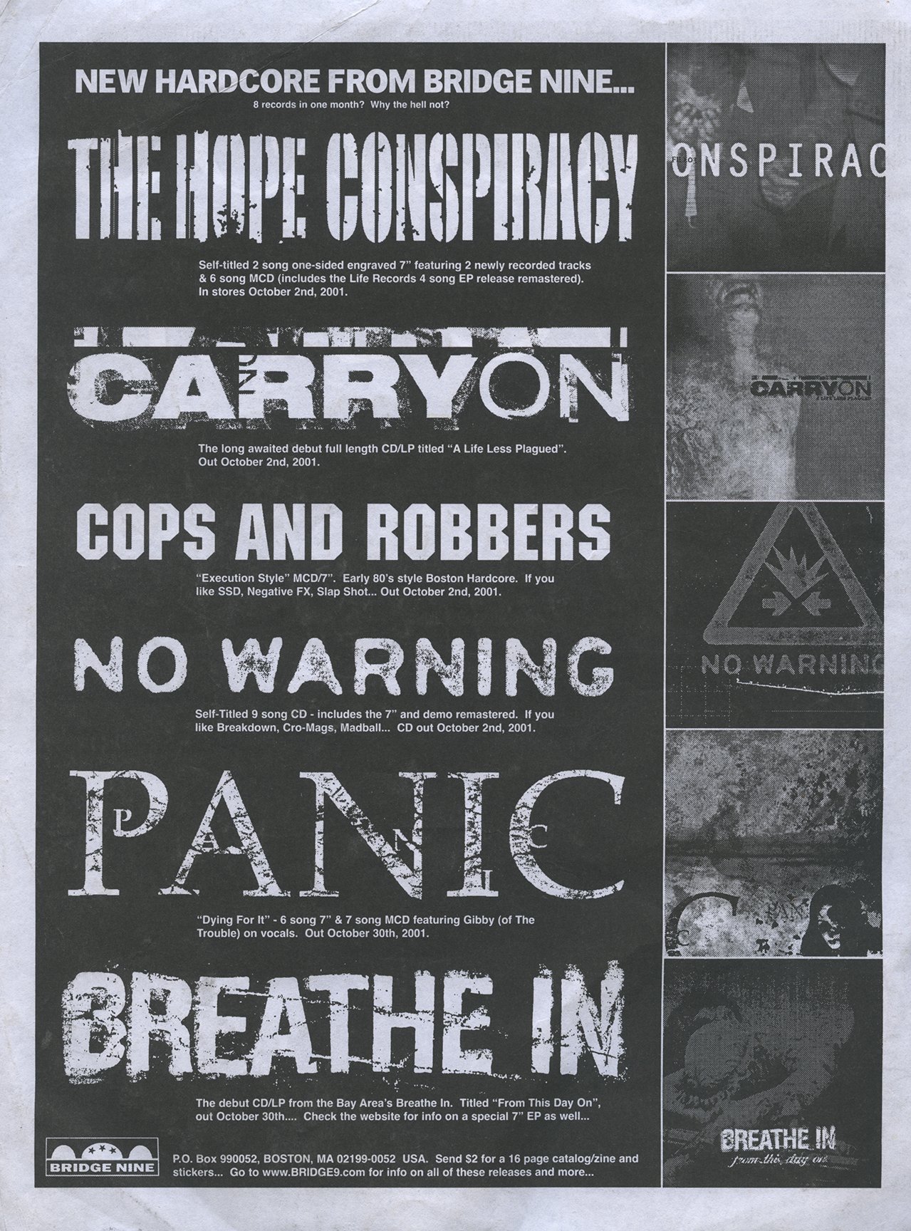 Bridge Nine's first proper full-length album (not just a vinyl-only license, as was the case with Death Threat's Peace & Security LP). Bridge Nine covered everything from the plane tickets to the van rental to the recording of the album, so when it came time to press the record, we had to cut the original gatefold LP jacket designed by Jacob Bannon (Converge, Deathwish Inc.) to a standard LP sleeve to save money when it was originally released in 2001. Carry On didn't live on much longer after their full-length album debut but it became a definitive release for the label (and California hardcore) as each member went on to form the next wave of West Coast hardcore bands (such as Terror, Piece By Piece, Betrayed, Internal Affairs and many more). Long out of print by the album’s 10th anniversary, its legacy was further set in stone with a 2011 re-issue, which included the original gatefold jacket that had been scrapped a decade earlier to help cut costs. There was a very limited variant of this LP and a story behind it: Linas Garsys (most notably known for his illustration work for American Nightmare) was on the Fall 2001 tour with Carry On, and hand illustrated the shrink wrap of around 8 (?) clear vinyl copies with a black sharpie. Each illustration was unique; we have a photo of one in our discography below.