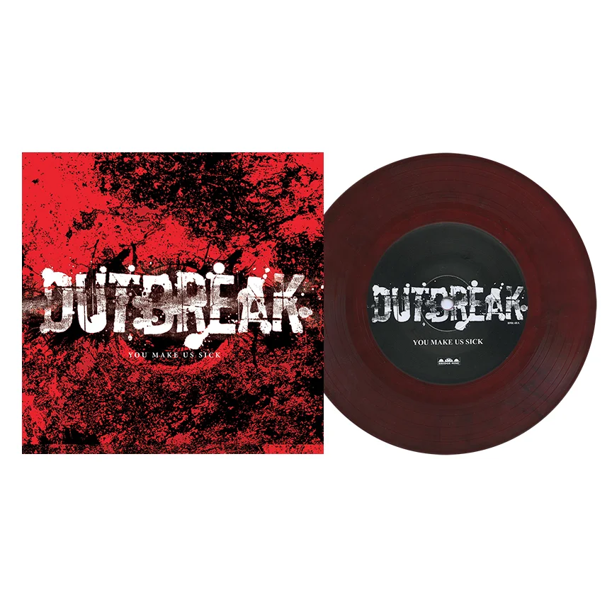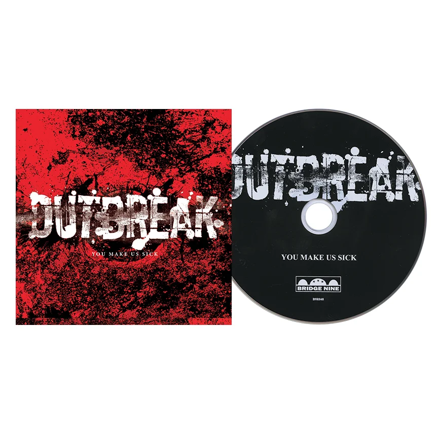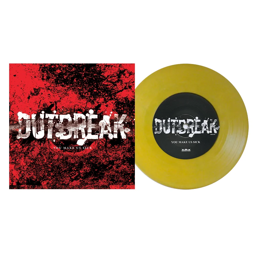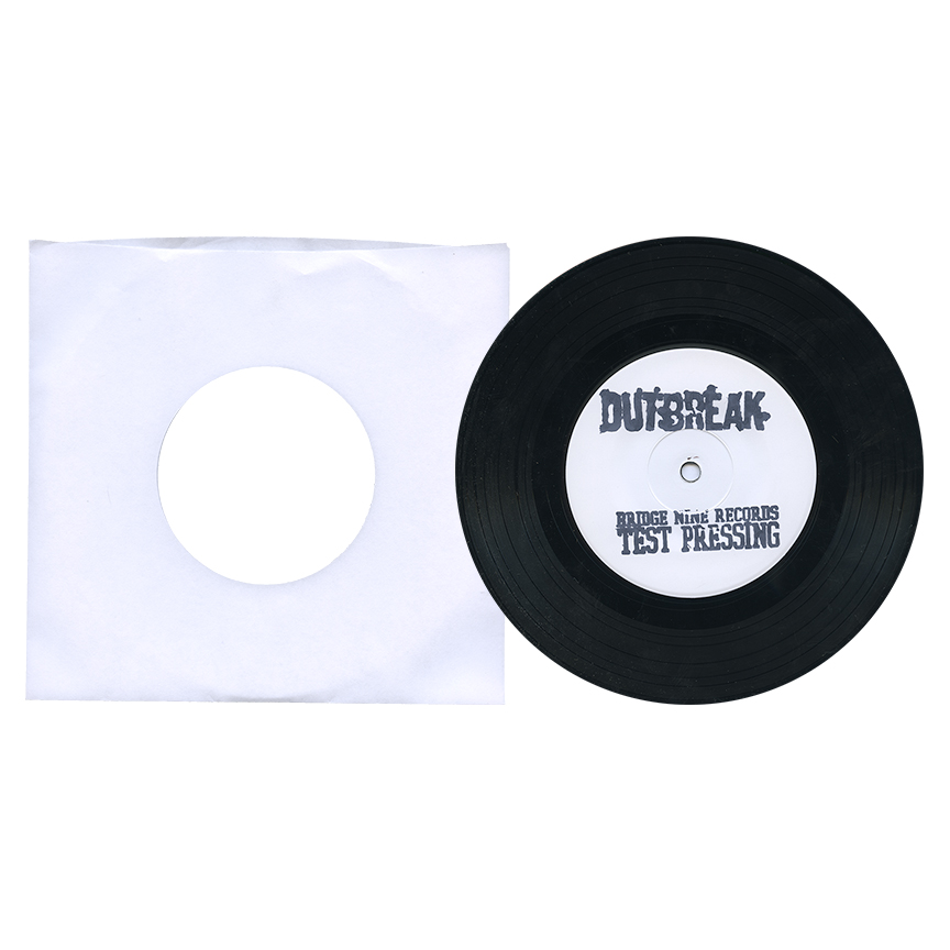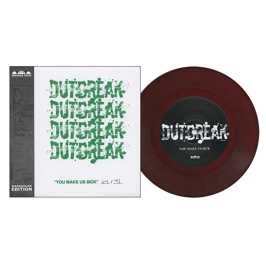 Outbreak's Bridge Nine debut. The band initially went into the studio with legendary hardcore producer Don Fury (Judge, Youth of Today) and recorded 11 songs, but it only clocked in at 10 minutes of music. So, those tracks made up the 7" version of the EP, and the band went into the studio again and recorded 4 more songs for the CD. The vinyl of this EP had two very similar colors used, so it's hard to tell the difference between the /340 and /770 variants. Both used a solid yellow marble base, but the more common variant had black mixed in, and the rarest variant had green mixed in (both were to give it a "vomit" look, as the cover art features a dirty sink). There was an overrun on the vinyl (or a shortage on covers, or a mix of both) so we ended up with over 200 copies without 7 inch jackets, so we screen printed a repeating Outbreak logo on blank "Warehouse Edition" covers and sold the remaining copies in two hand-numbered editions. There was also a 12" version of the EP licensed by Burial Records (UK) which included all 15 songs and was limited to a one time pressing of 500 copies.