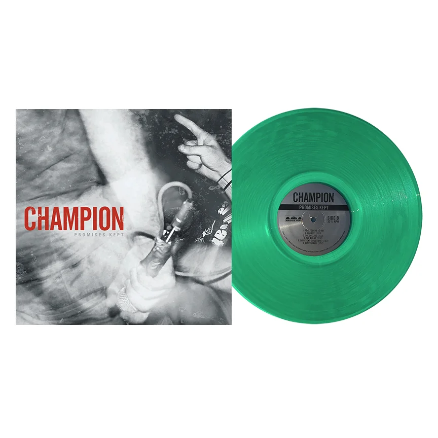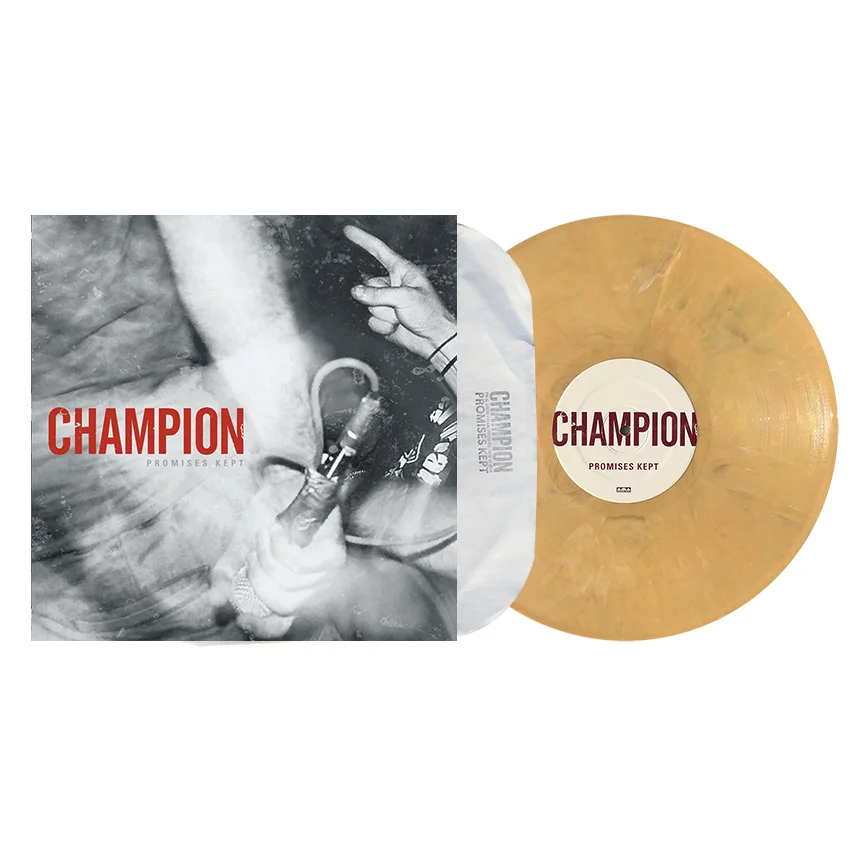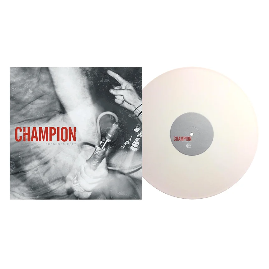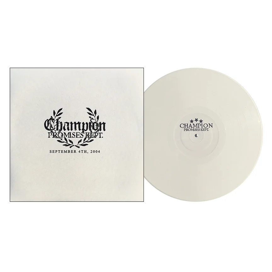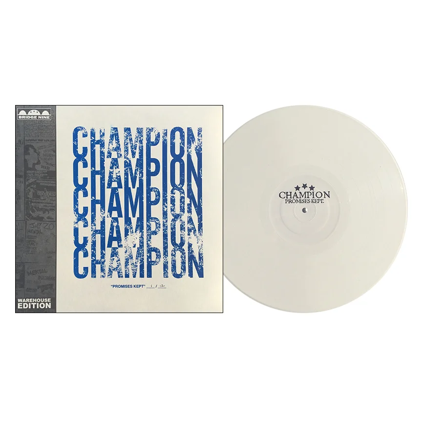 The vinyl discography for Champion's Promises Kept is literally the reason why we want and need to include all of the information about every possible variant. So, *deep breath* the first set of test pressings was rejected, because the band decided that they weren't happy with the mix of the album. Since the plates were made, and to pay homage to the Judge "Chunk King" album session, the band decided to press the first mix on 150 copies of white vinyl, with blank white hand stamped center labels. Screen printed jackets were made for the bands record release, but collectors should note that of the 150 covers, the first 51 include the Bridge Nine logo on the back, while the remaining 99 do not, because the logo became blocked during the printing process. A second set of test pressings were ordered and approved, and 3 more colorways were made, including a 220 piece translucent blue tour press with blank white center labels and "Champion Promises Kept" printed on them with a custom made blue rubber stamp. This album was also licensed to the UK label Dead & Gone for release as an LP in the UK/Europe, and Refuse Records released a full version on cassette, mostly for distribution in Eastern Europe where cassette sales were more prevalent at the time. Sometime after the band had already broken up, Bridge Nine took the remaining overrun of raw vinyl that did not have accompanying covers, and created a "Warehouse Edition" of a couple of the colorways available.
