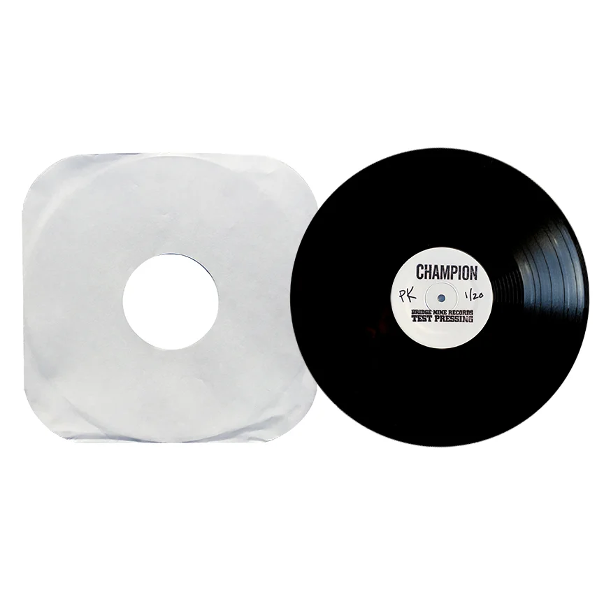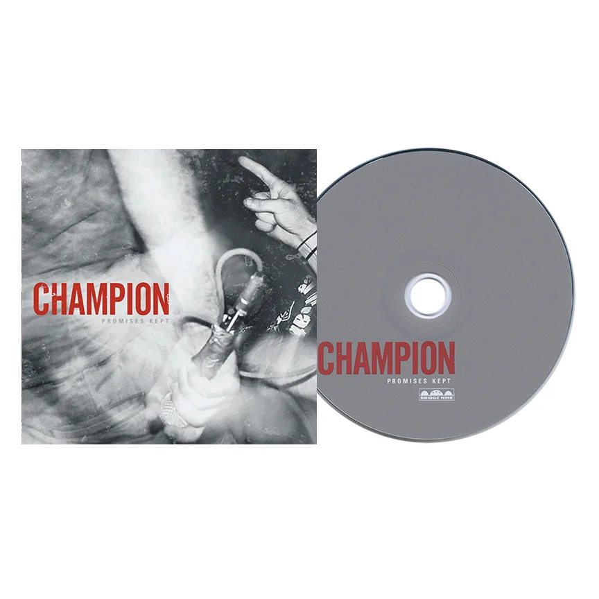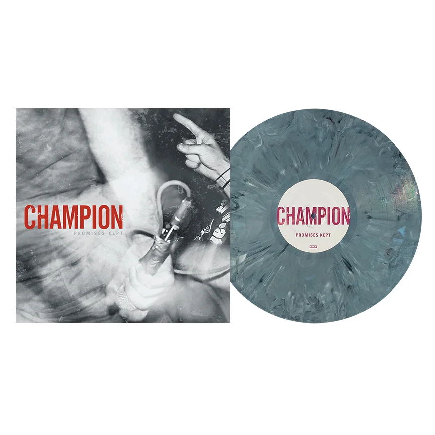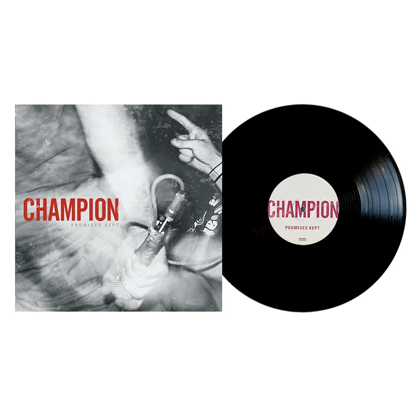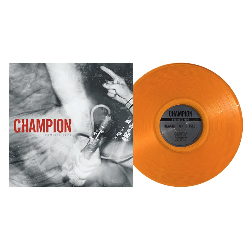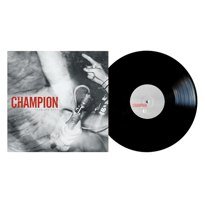 The vinyl discography for Champion's Promises Kept is literally the reason why we want and need to include all of the information about every possible variant. So, *deep breath* the first set of test pressings was rejected, because the band decided that they weren't happy with the mix of the album. Since the plates were made, and to pay homage to the Judge "Chunk King" album session, the band decided to press the first mix on 150 copies of white vinyl, with blank white hand stamped center labels. Screen printed jackets were made for the bands record release, but collectors should note that of the 150 covers, the first 51 include the Bridge Nine logo on the back, while the remaining 99 do not, because the logo became blocked during the printing process. A second set of test pressings were ordered and approved, and 3 more colorways were made, including a 220 piece translucent blue tour press with blank white center labels and "Champion Promises Kept" printed on them with a custom made blue rubber stamp. This album was also licensed to the UK label Dead & Gone for release as an LP in the UK/Europe, and Refuse Records released a full version on cassette, mostly for distribution in Eastern Europe where cassette sales were more prevalent at the time. Sometime after the band had already broken up, Bridge Nine took the remaining overrun of raw vinyl that did not have accompanying covers, and created a "Warehouse Edition" of a couple of the colorways available.