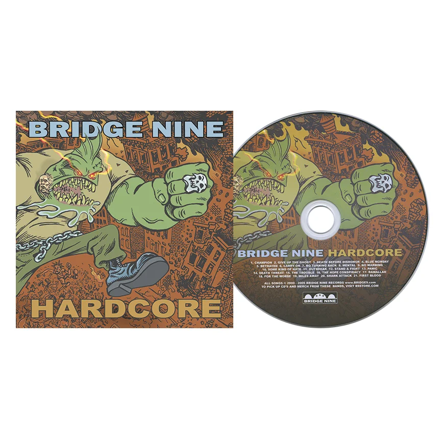 BRIDGE NINE: Hardcore was a 21-song "greatest hits" collection featuring bands active on the label through the summer of 2005. A crash course in a more recent chunk of the label’s history (at the time), this CD was a low-cost sampler available exclusively at Hot Topic stores and sold on the counter for $4.99. A great introduction to a whole new generation of kids. The disc featured cover art by celebrated NYHC illustrator Sean Taggart. It was given catalog #B9R060 shortly after the No Warning Suffer Survive LP was scrapped (after the test pressings had been received reflecting B9R:60 on the record's matrix).