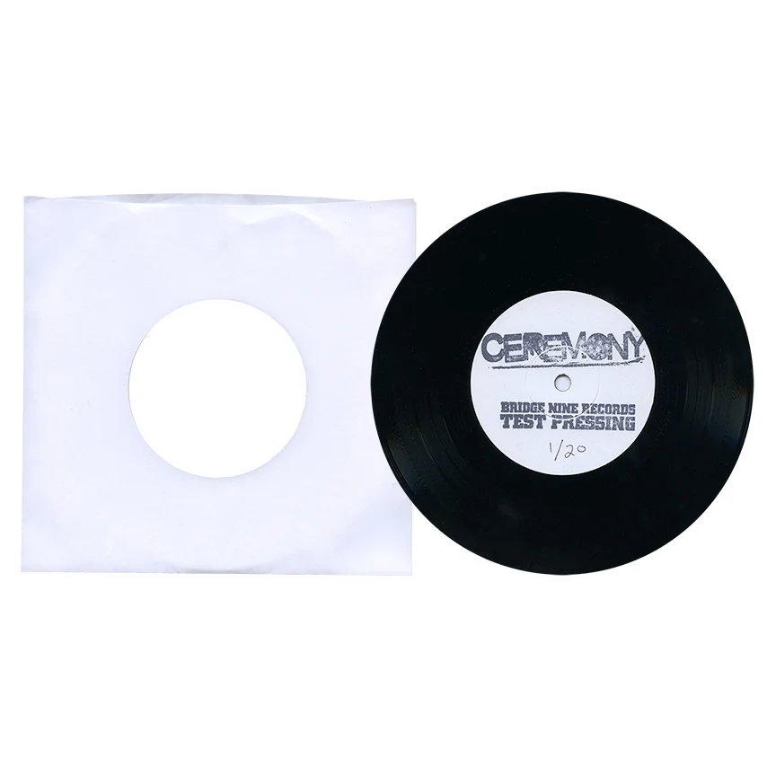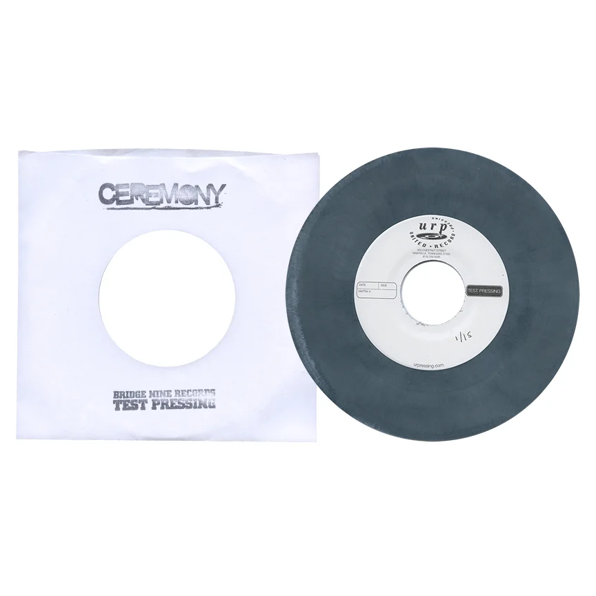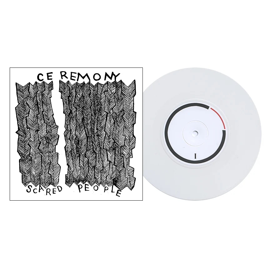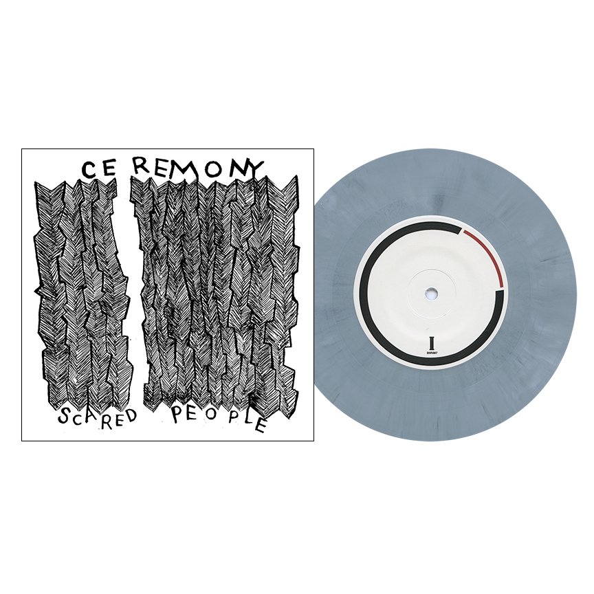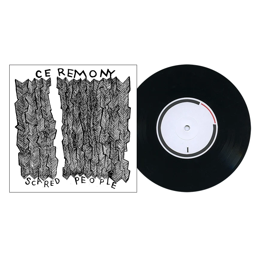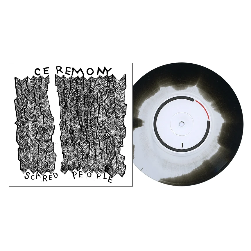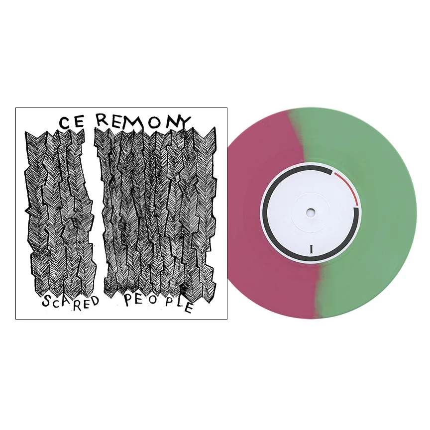 Scared People, Ceremony's six-song 7-inch Bridge Nine debut was a mostly monochromatic release. The first two pressings featured only black and white vinyl colorways, except for a "friends press" that has been referred to as the "Easter Egg Press", because it is a split pink and green vinyl and was limited to only 100 copies. A vinyl broker pressed them for GZ in the Czech Republic, who ultimately went out of business, so the 3rd and subsequent pressings were pressed at United Record Pressing in Nashville, TN after a new set of test pressings were approved.