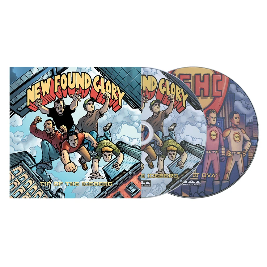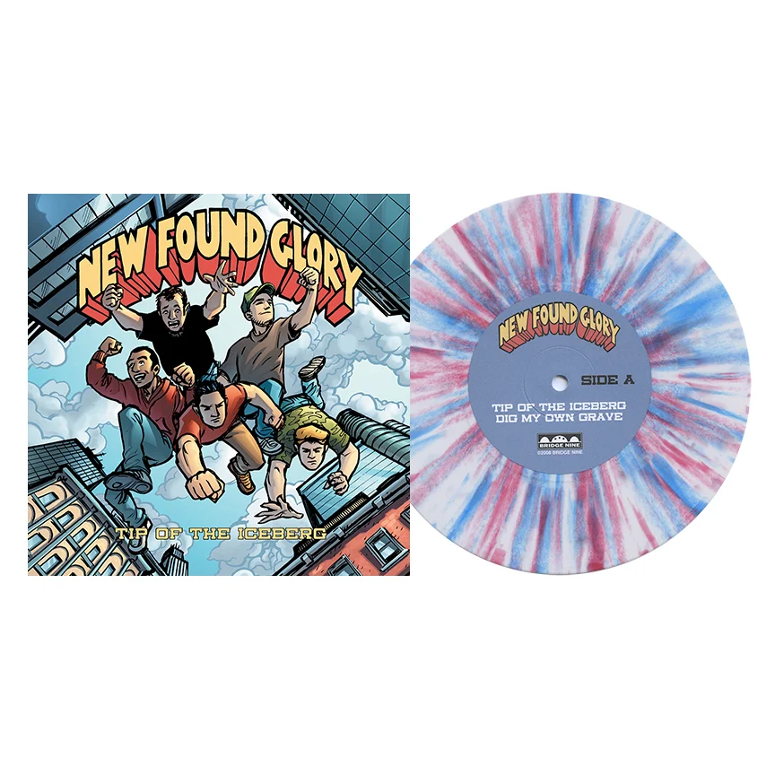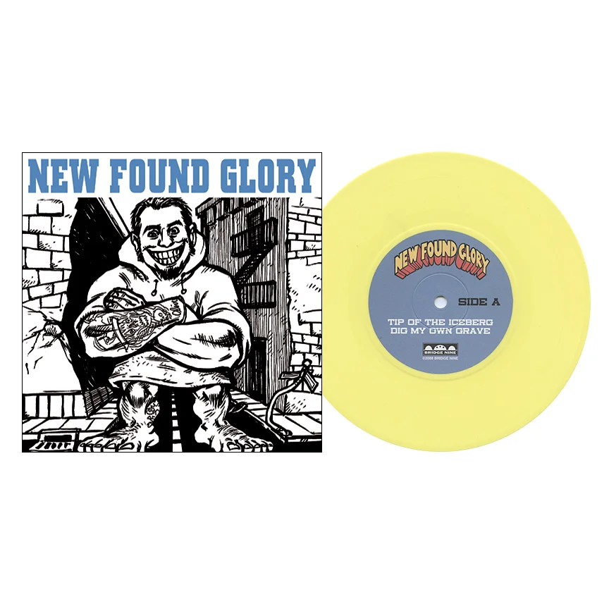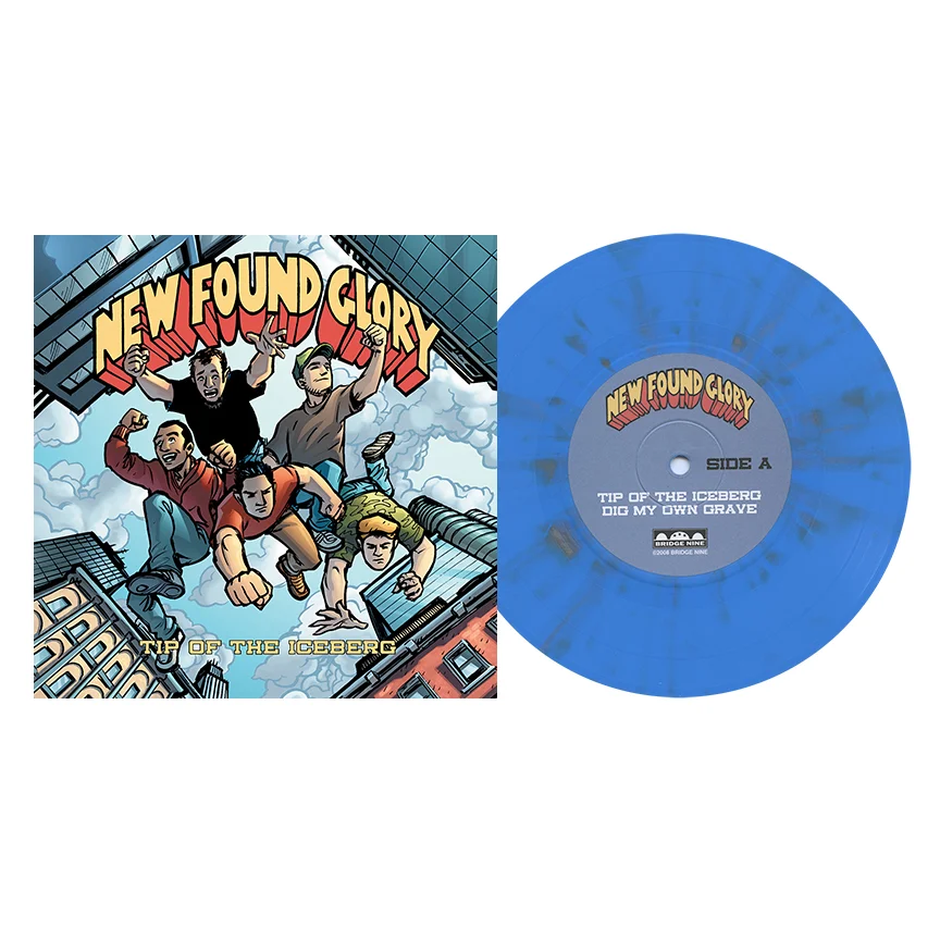 Tip Of The Iceberg was New Found Glory's Bridge Nine debut and featured 3 of the songs on 7-inch format. Two original tracks on side A and a cover of ˆ on the B-side. The single had a couple of notable variants, including a limited-to-100 edition on blue spattered vinyl and a limited-to-500 variant on opaque yellow vinyl with a secondary cover featuring an illustration of bass player Ian Grushka as the gorilla in tribute to the Gorilla Biscuits self-titled EP. The single was also released as a one-time pressing of 2,500 copies on a 7-inch picture disc. The test pressing included the full-color center labels of the standard pressing, so to differentiate it from the later black vinyl 2nd pressing, we used four different rubber stamps on the white dust sleeve and hand-numbered each copy.