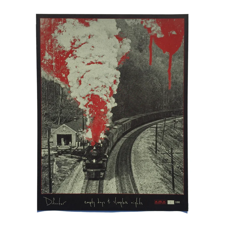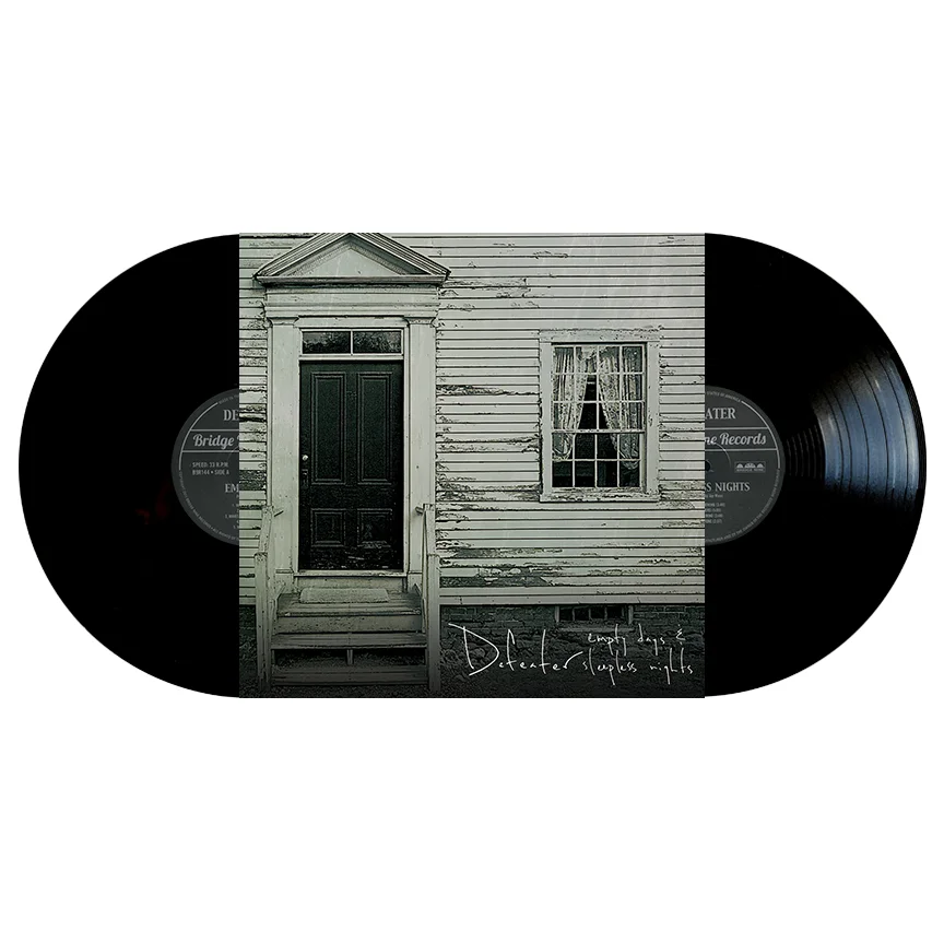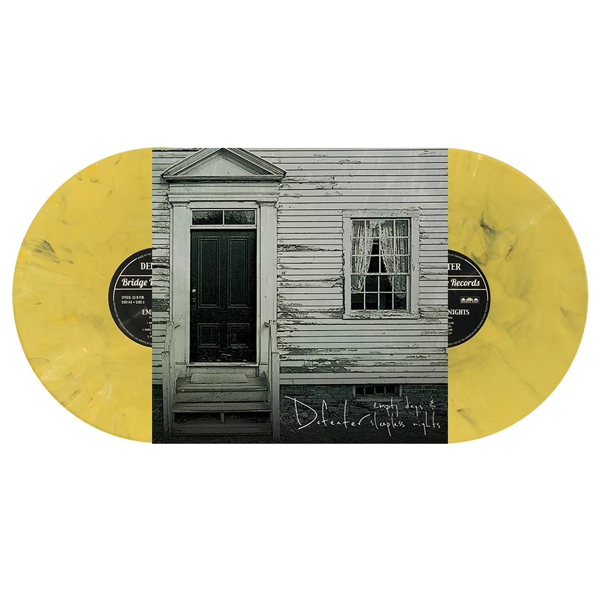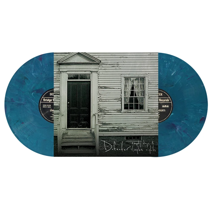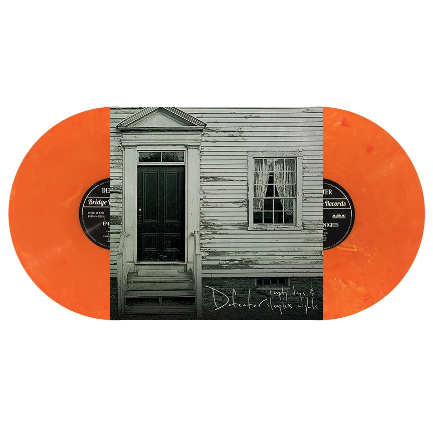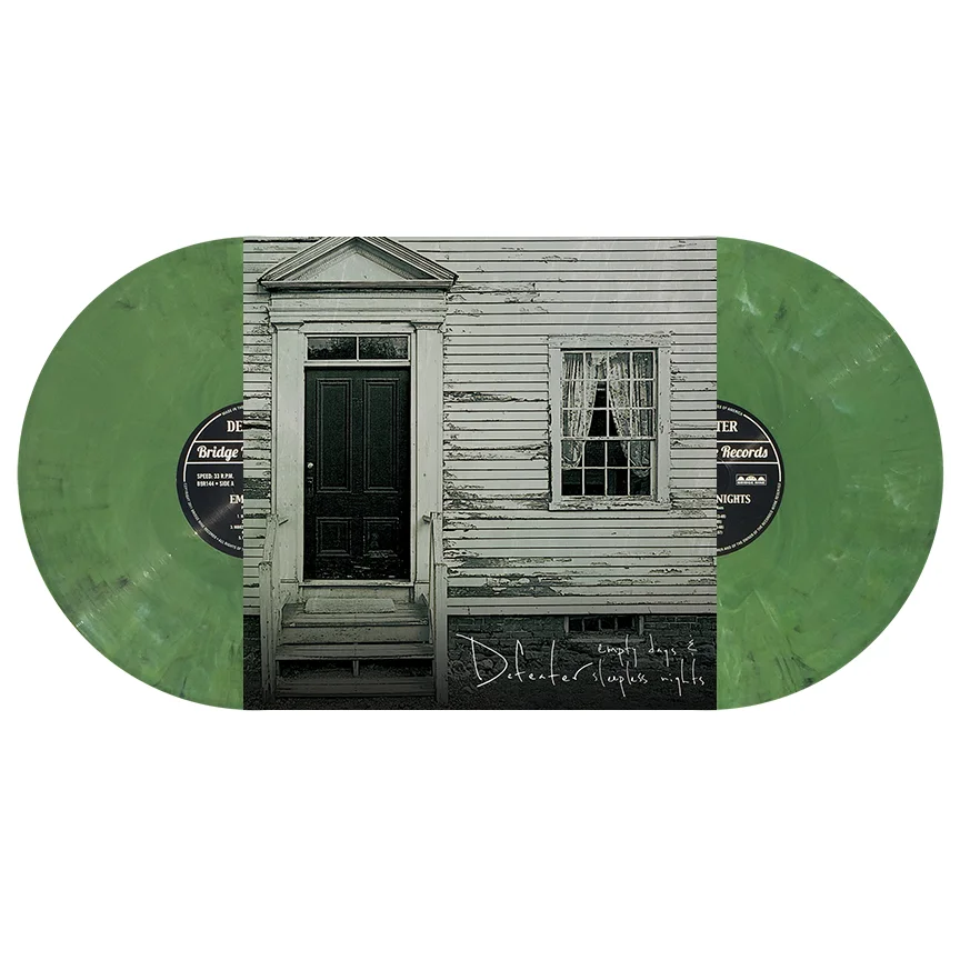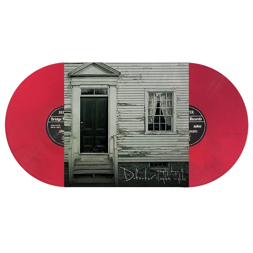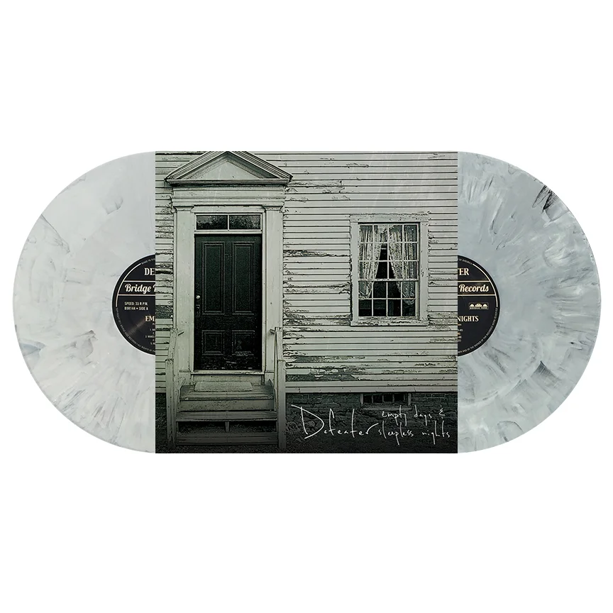 Defeater's Empty Days & Sleepless Nights vinyl release. Fourteen songs are featured on three sides of a 2xLP, packaged inside a gatefold LP jacket. Sides A and B feature ten songs that continue from their previous Lost Ground EP, side C features four acoustic songs in the vein of the recently released track "I Don't Mind,” and side D is a circular train spike etching—pressed on standard weight 140-gram black vinyl with red center labels.