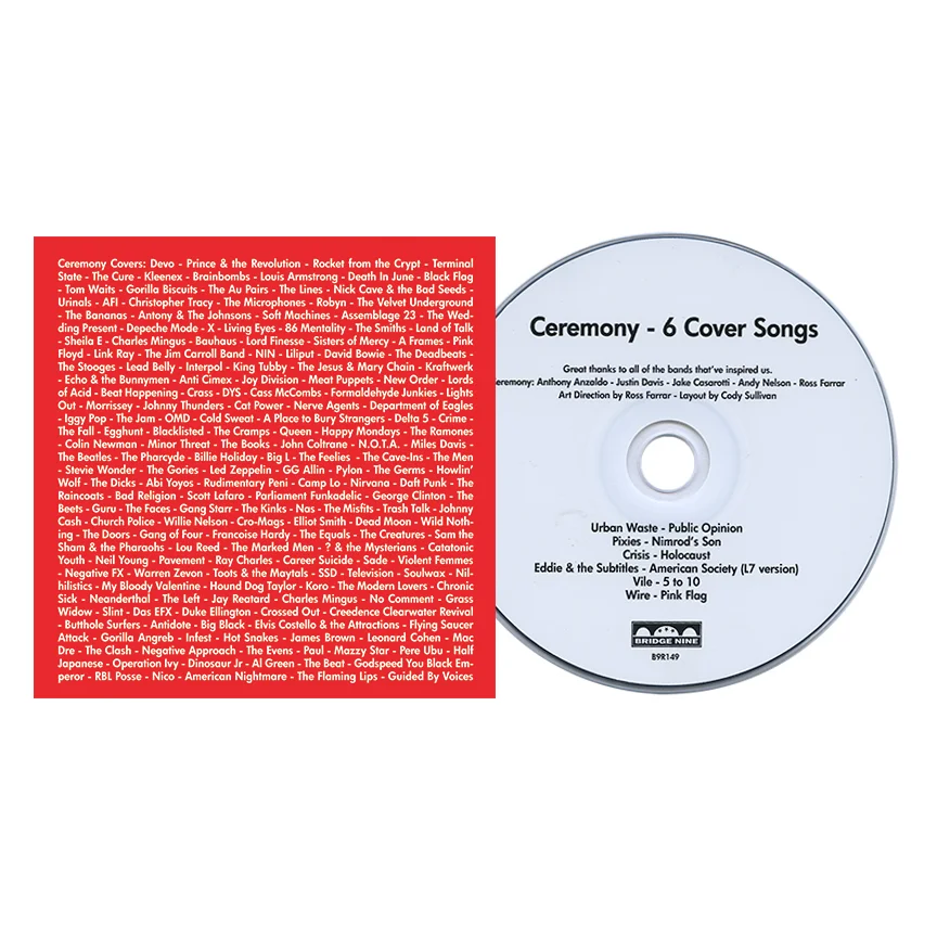 The 6-song EP features covers of songs originally performed by Urban Waste, Pixies, Crisis, Eddie and the Subtitles, Vile, and Wire, and were recorded with Dan Rathbun as outtakes during the Rohnert Park recording session. 6 Cover Songs pays homage to a few of the artists that have influenced Ceremony along the way and will continue to inspire them.