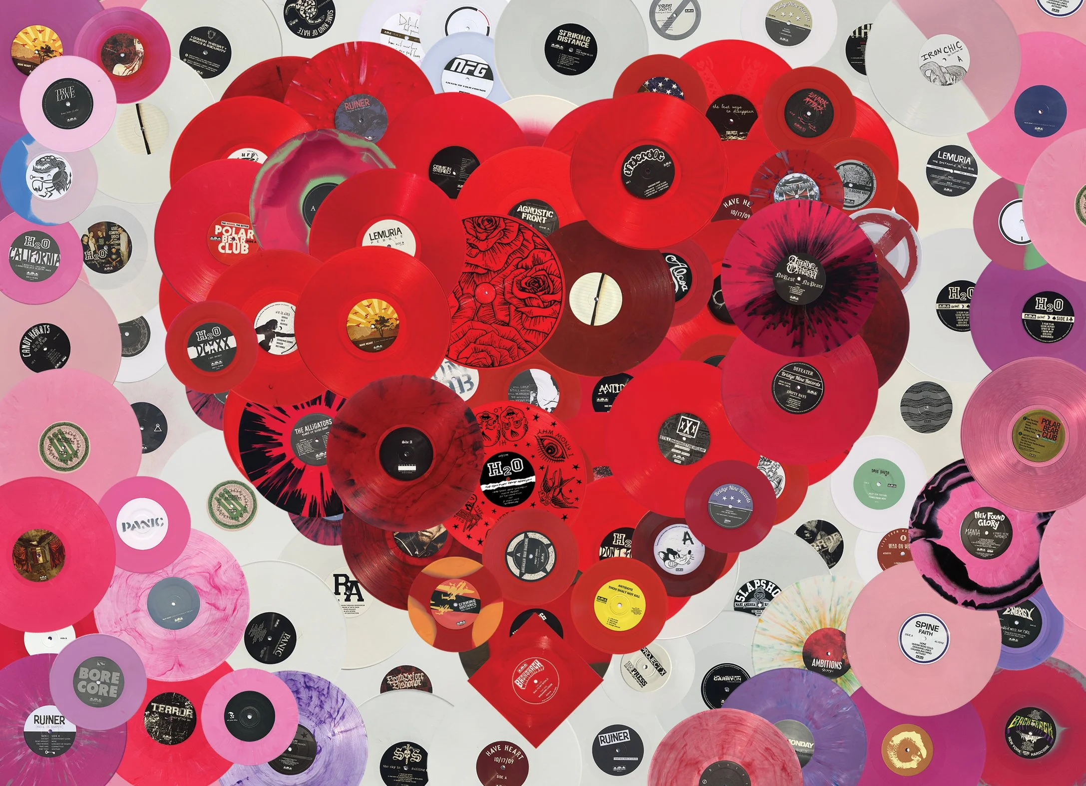 Valentine’s Day heart collage made entirely from Bridge Nine’s vinyl discography